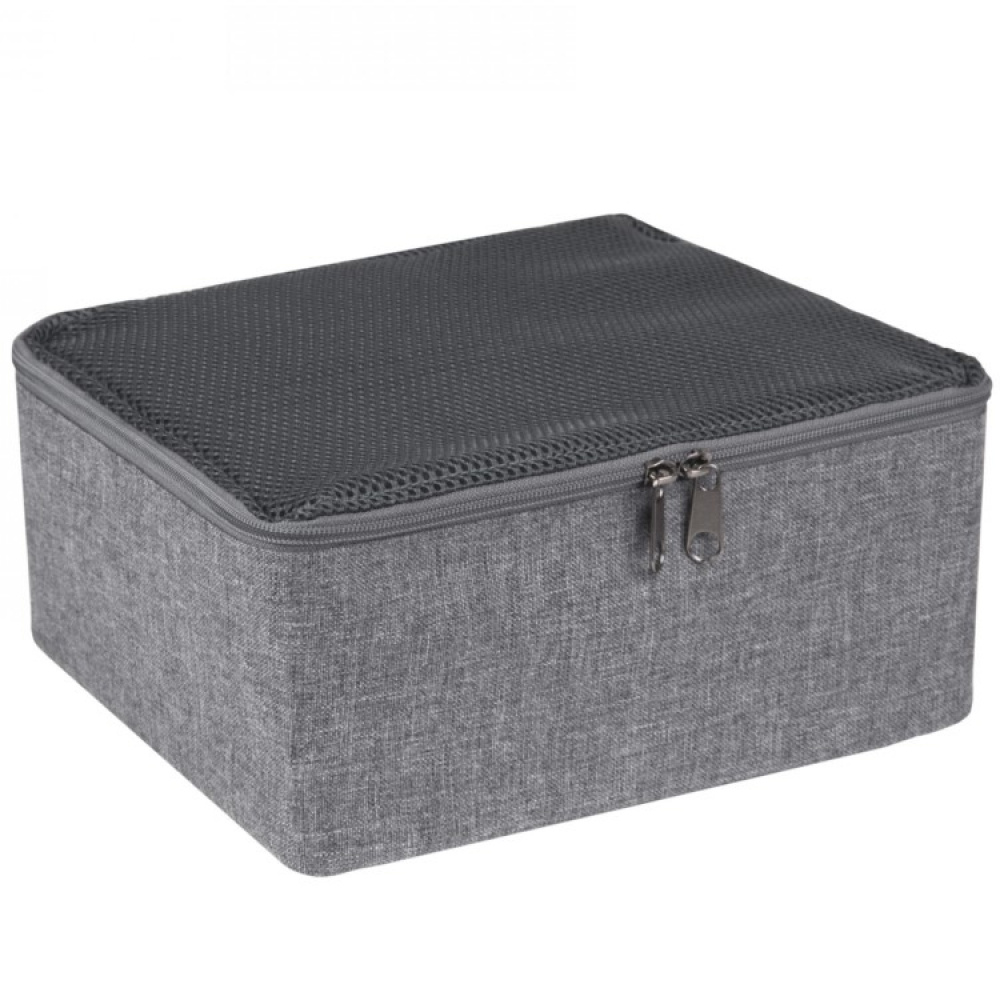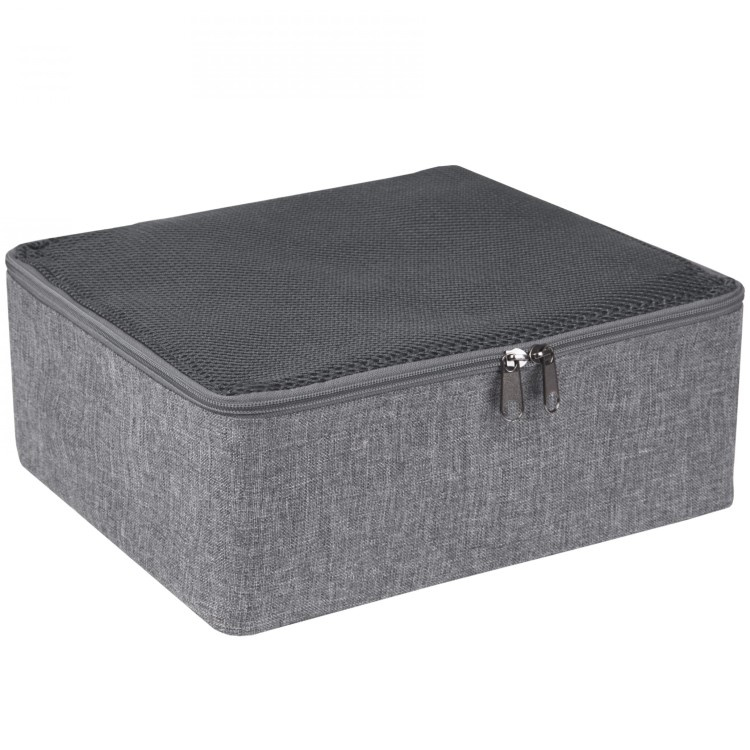 The packing cube is lightweight and collapsible and has double zippers that make it easy to open and close. The mesh on the top of the packing cube ensures that your clothes are ventilated and you don't have to open the packing cube to see what you've packed. The handle on one short end makes it easier to lift the cube with all your clothes inside.Fits in most drawers