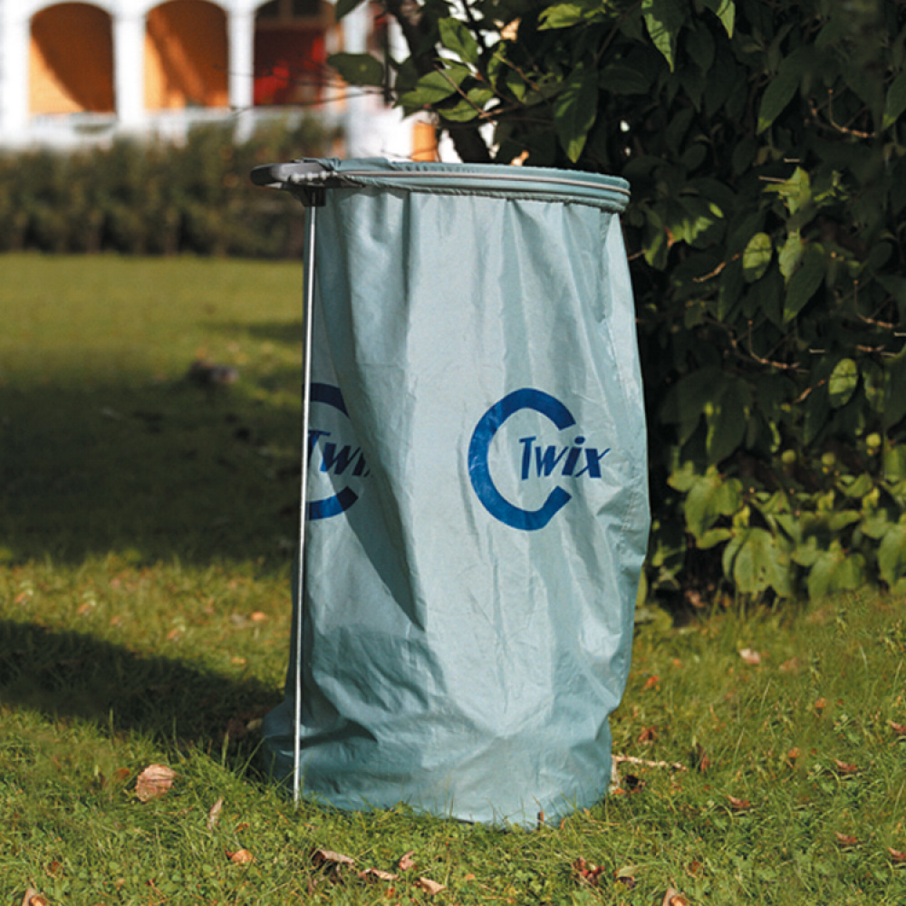 Insert the pole into the ground and attach the sack holder onto it. The sack holder keeps the sack standing while you work.