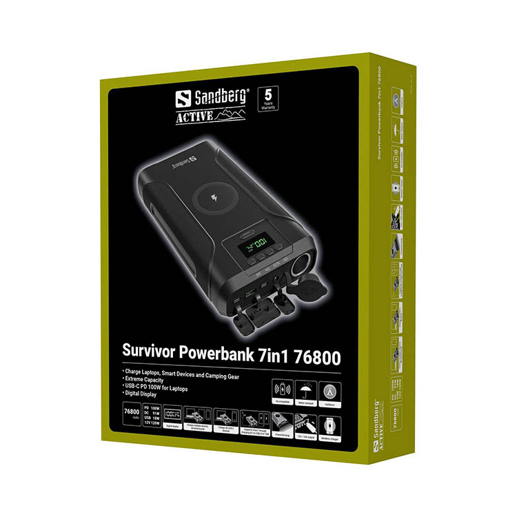 Sandberg Survivor Powerbank 72000 mAh 7-in-1 is a great powerbank capable of charging a laptop, smartphones, cameras and many other devices with rechargeable batteries. The powerbank has an extra strong battery that can charge a smartphone every day for almost a month. Plus, it's strong enough to charge your laptop and several other devices at once.