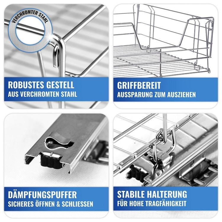 The pull-out shelf is of high quality. Made of chrome-plated, highly polished steel.