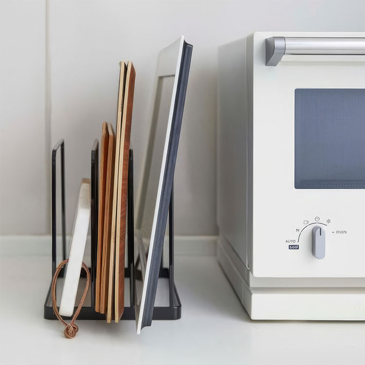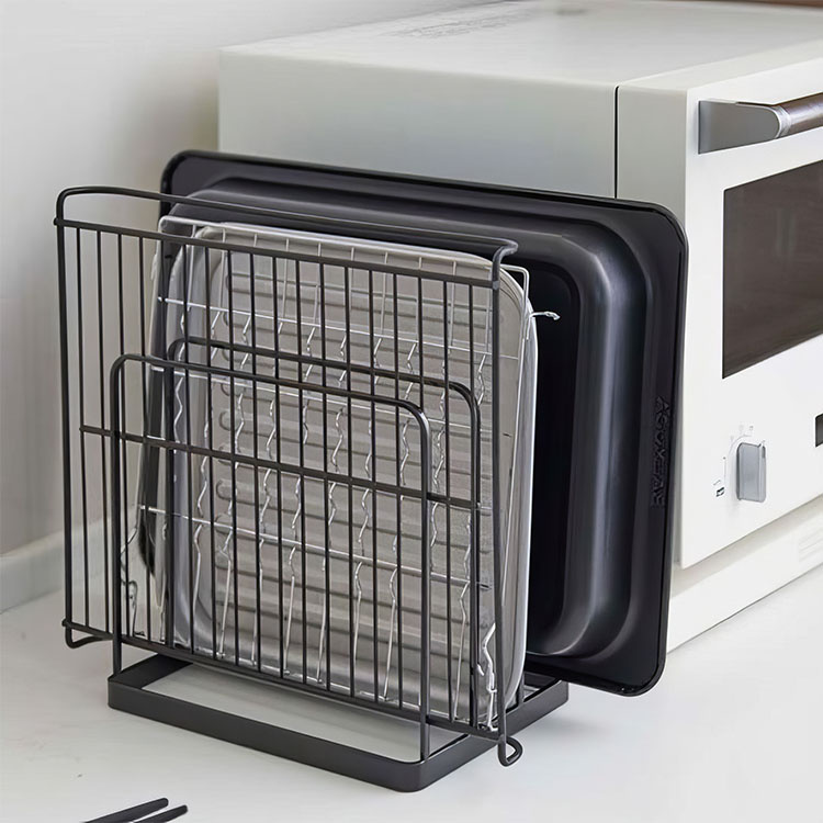 With this smart looking tray stand in metal, you can store different kinds of thin plates such as trays, roasting tins or oven grids tidily.