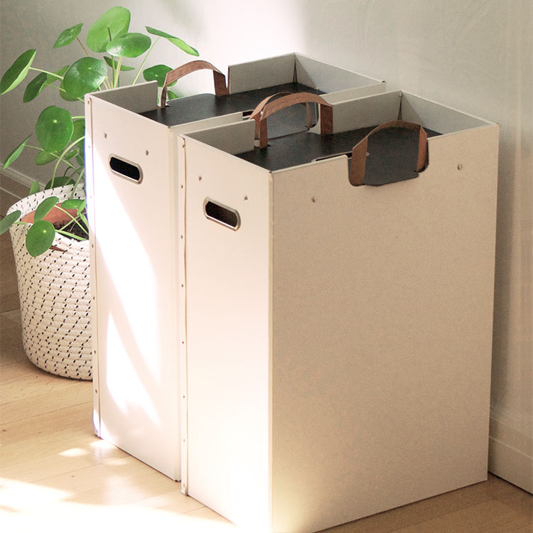 The recycling box is made of recyclable cardboard. The cardboard is coated with a water-based paint. The reinforced handles on the short sides make it easier to move the bin.