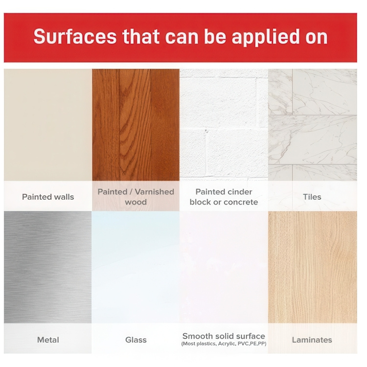 Suitable for most smooth surfaces including painted walls, tiles, metal and wood.