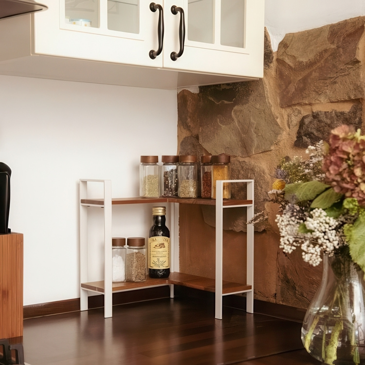 The shelf fits in a corners and is placed directly on the kitchen counter.