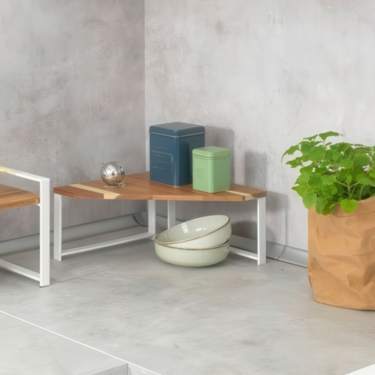 Small shelf for the kitchen counter or in a cabinet. In white lacquered metal and acacia wood.