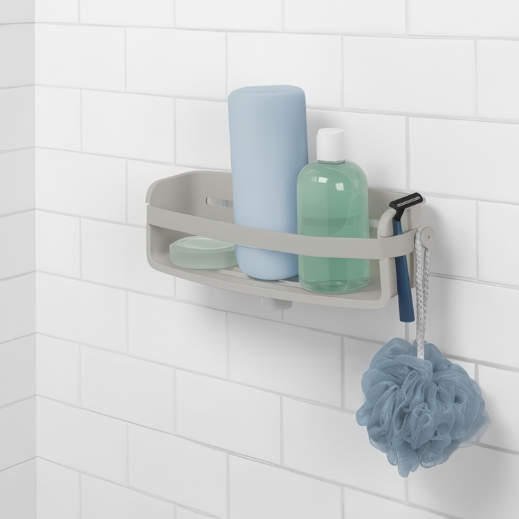 A shower storage basket from Umbra with Flex Gel-Lock suction cup. Enough room for shampoo, conditioner and shower cream. Flex Gel-Lock uses a vacuum to hold the shower basket in place. The storage basket has drainage holes and is rust protected. No assembly is required and unsightly boreholes in the wall can be avoided.