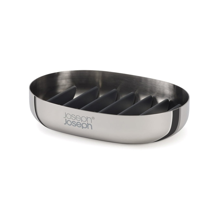 Compact soap dish with a polished stainless-steel finish, with draining rack that allows soap bars to drain quickly.