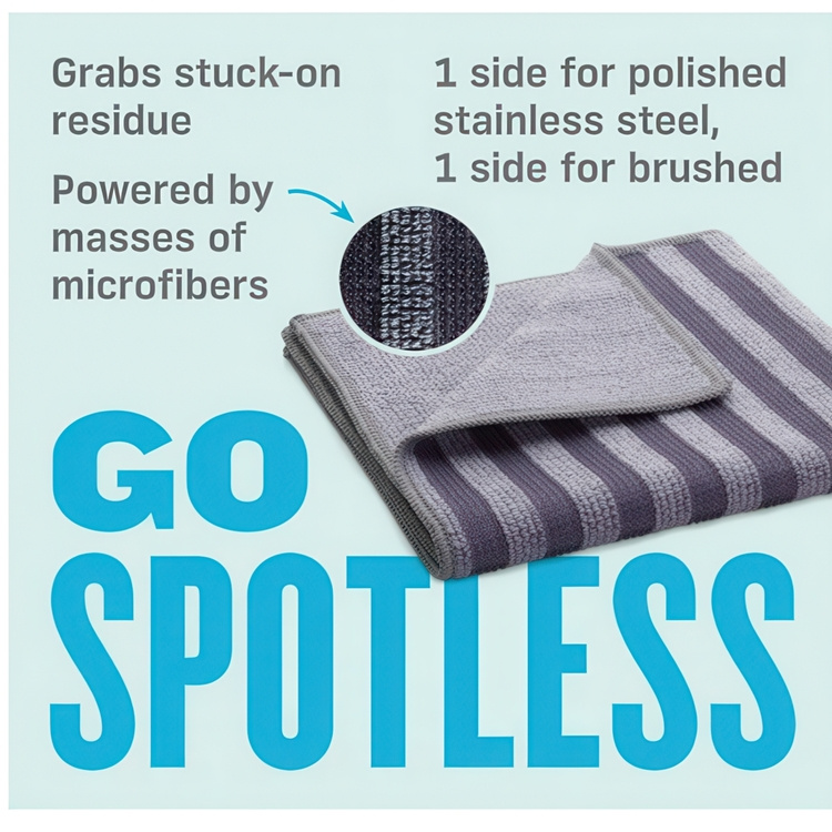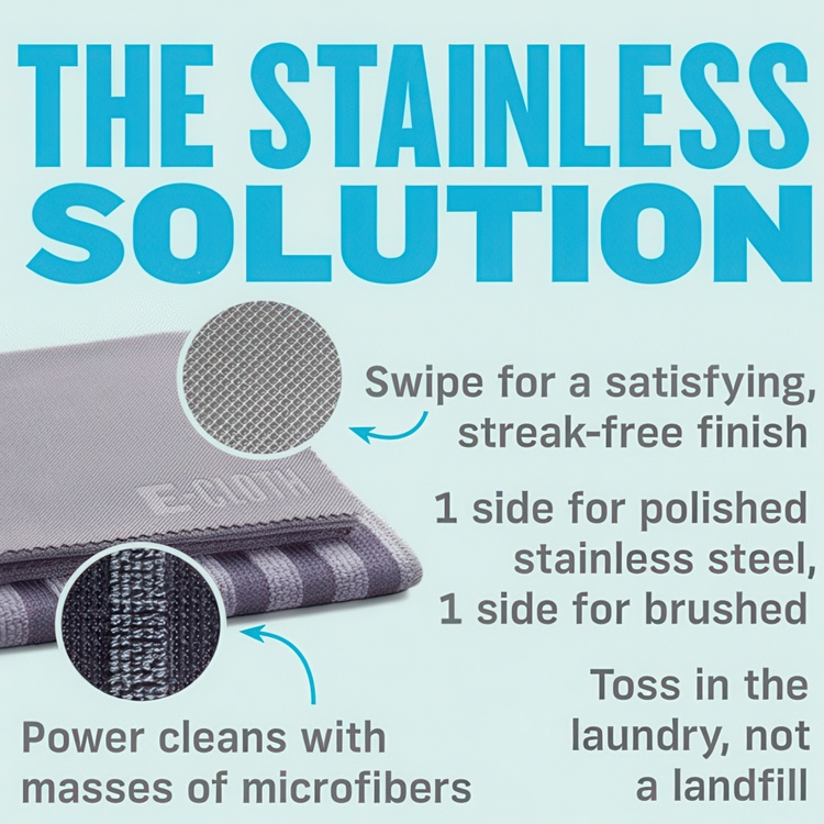 The Stainless Steel Cloth is versatile on all stainless steel, and has a designated scrubbing side for brushed stainless steel finishes and tough food residue, and a softer cloth side for polished stainless steel.