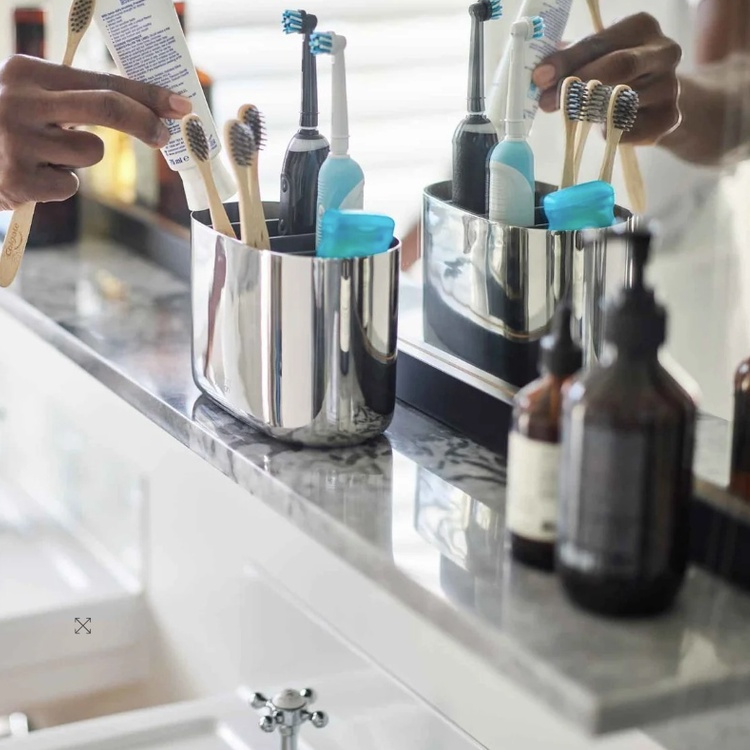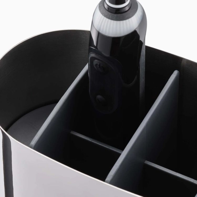 A toothbrush caddiy with different sections for organising a variety of oral care items such as manual or electric toothbrushes and toothpaste tubes.