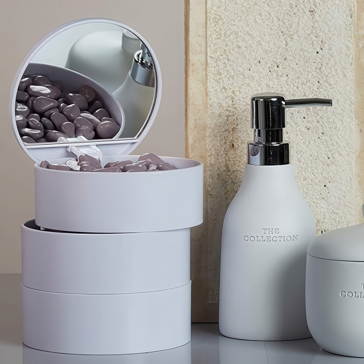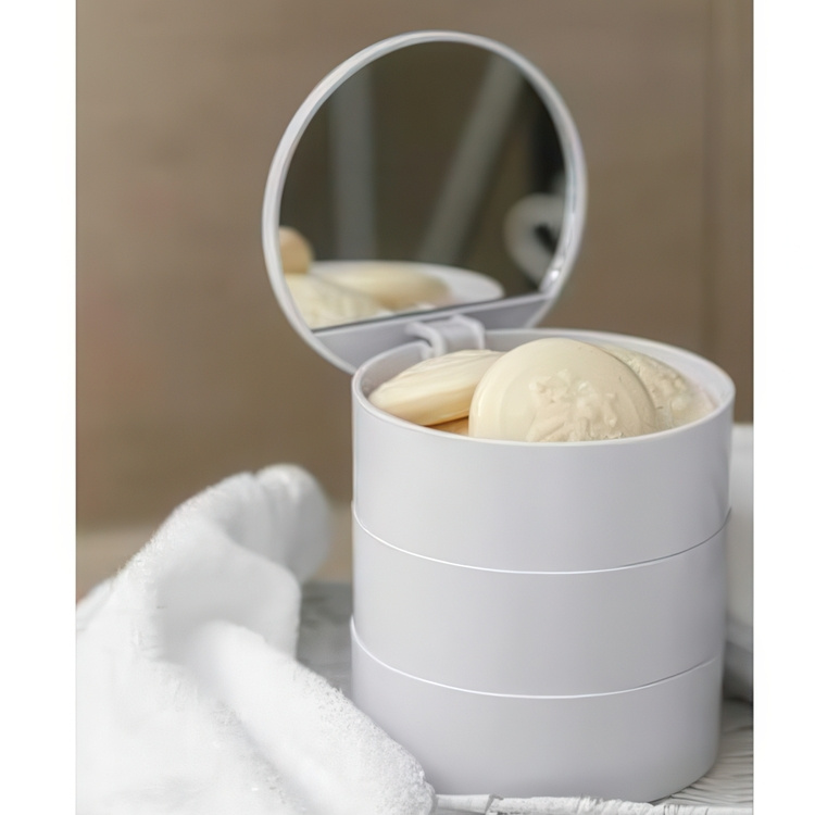 Practical container with 3 turnable compartments and mirror.