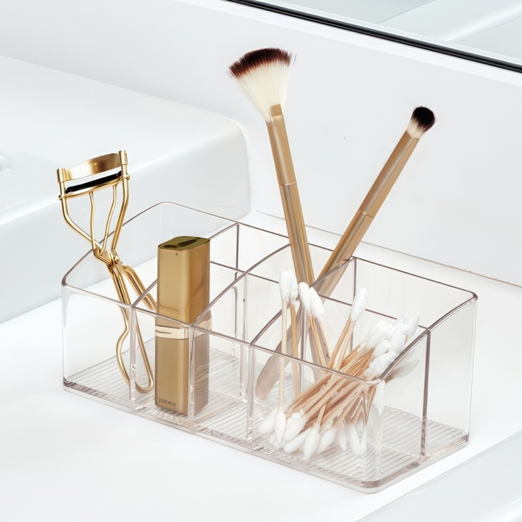 With dimensions of only 17,8 cm x 7,6 cm x H7 cm, this makeup storage even fits into small medicine cabinets, on the bathroom shelf or by the wash basin. -