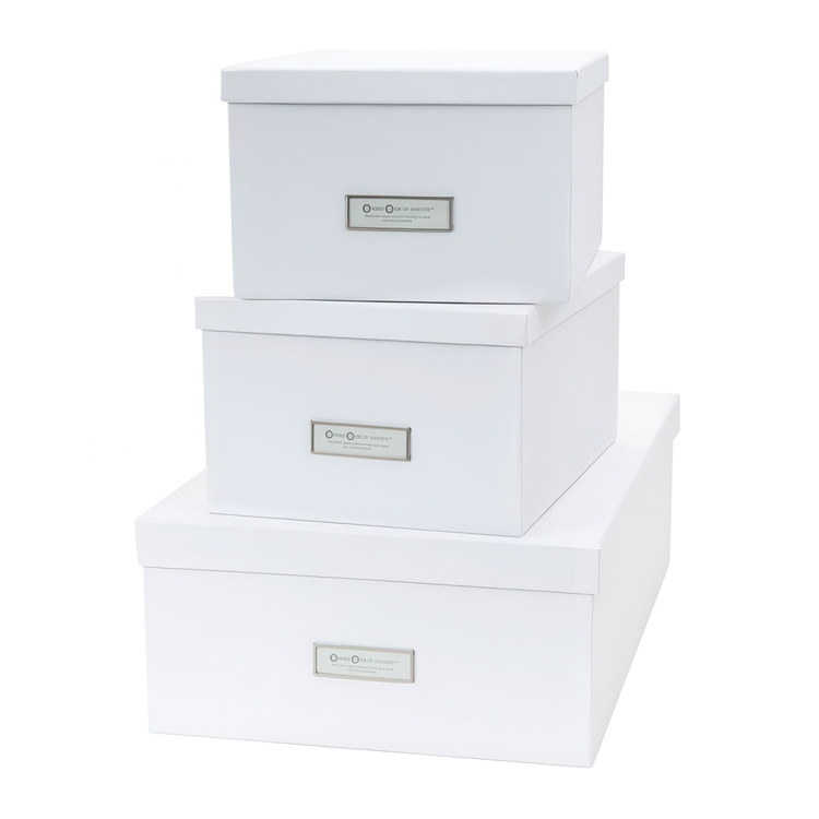Storage boxes INGE from Bigso. Three stylish and practical storage boxes. One big and two smaller. Suitable for paper and small items in the office or for clothes in the closet. Stackable with label. -