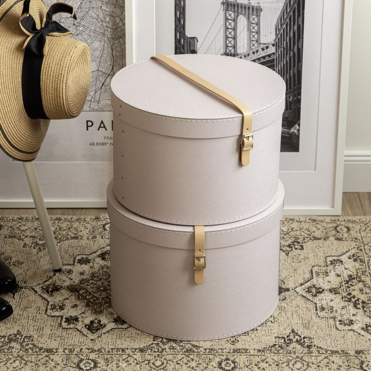Storage boxes RUT from Bigso. Two nice looking round practical storage boxes. One larger and one a little smaller. Stylish storage for everything from clothes to toys. The lid is fastened with a leather strap. -