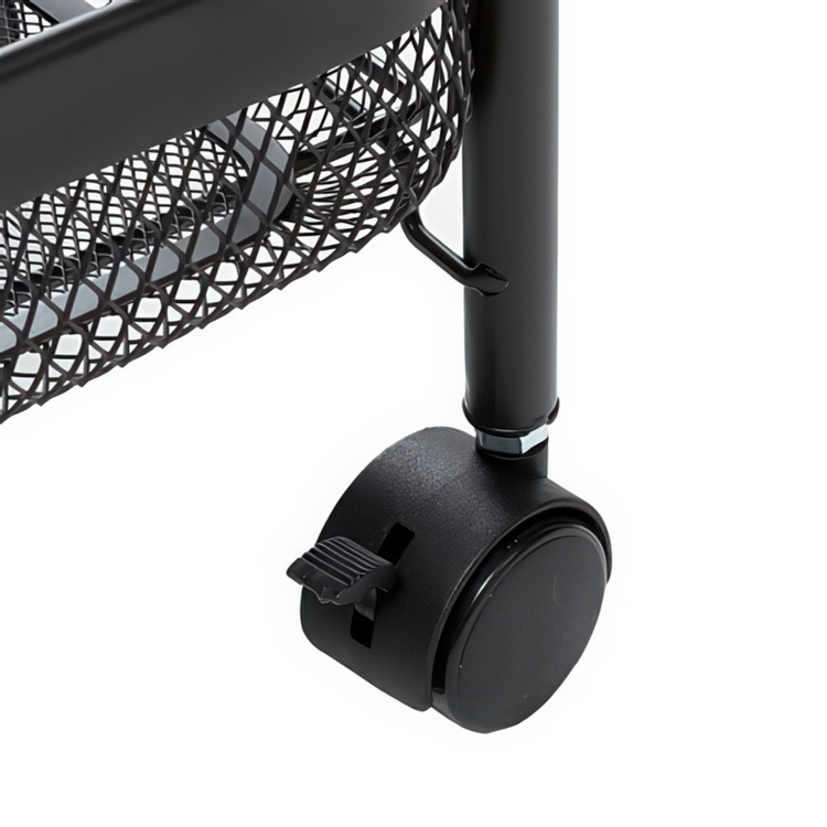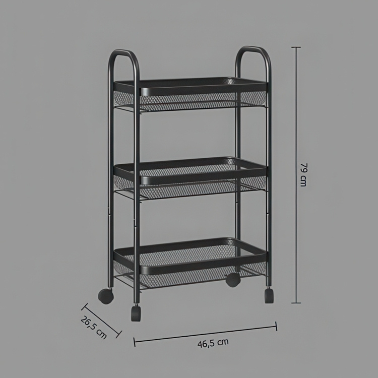 Black storage trolley with three large metal baskets.
