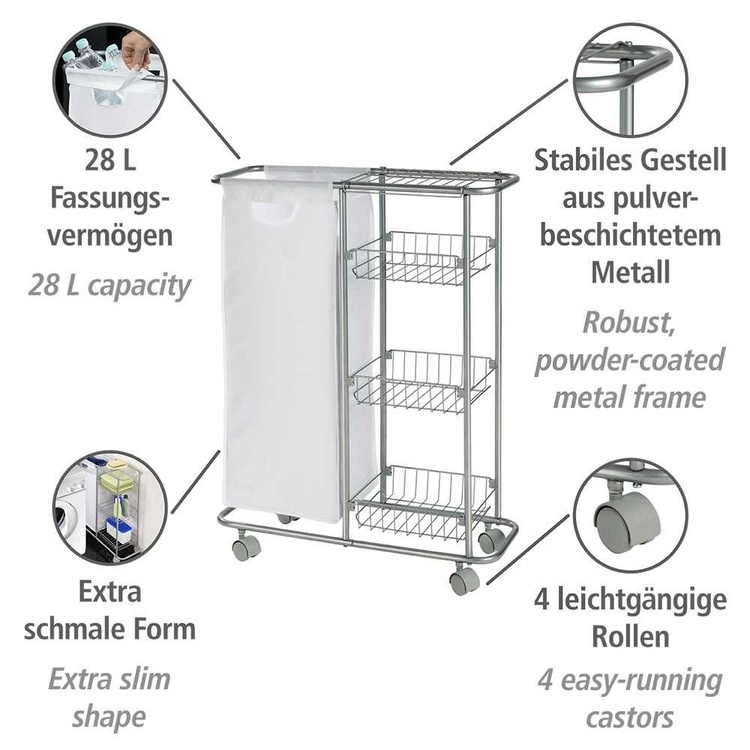 Storage trolley with bag, SLIM SAMMELWAGEN, 58 x 20 x H 80 cm, Silver Grey