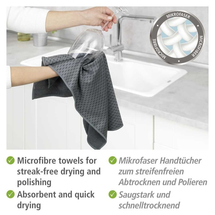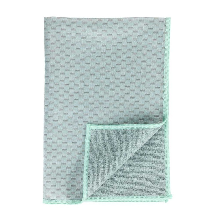 The kitchen towels have two different sides. A fuzzy side that is especially good for drying uneven surfaces. The smooth checkered side, on the other hand, is used to dry and polish smooth surfaces such as plates or glass. -