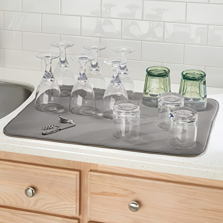 Highly absorbent thin quick-drying dish mat in grey. Let your cups, glasses, pots and pans dry quickly upside down and safely as they dry moisture and stain-free.