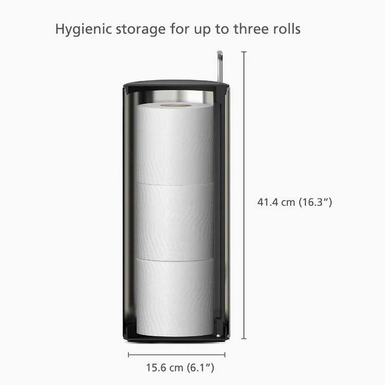 Holds up to three extra toilet rolls and keeps them hidden.