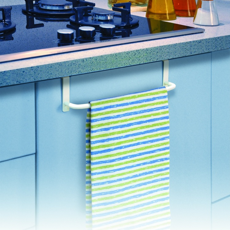 A towel rail /rod from Rayen. Easily hung over the cupboard door or drawer. No screws or glue needed. Looks nice and saves space.