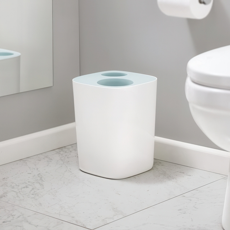 A small smart 8L trashcan from Joseph Joseph. Two different split openings in the lid for easier and cleaner separation before recycling. Cotton, paper or old toothpicks in one hole. Empty shampoo bottles in the other. -