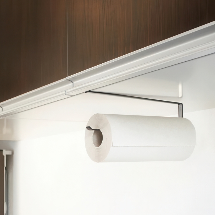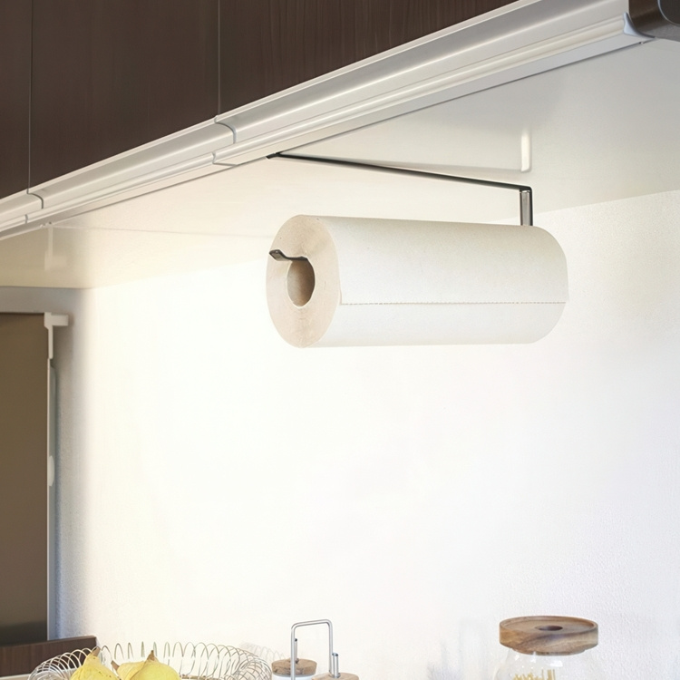 A stylish kitchen paper holder from Japanese Yamazaki. Attached to the underside of your cabinet or shelf. No screws or glue needed. Looks good and is space-saving.