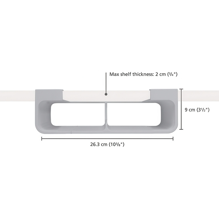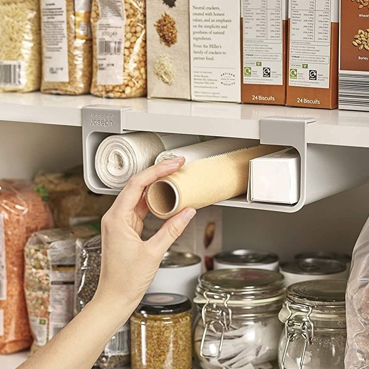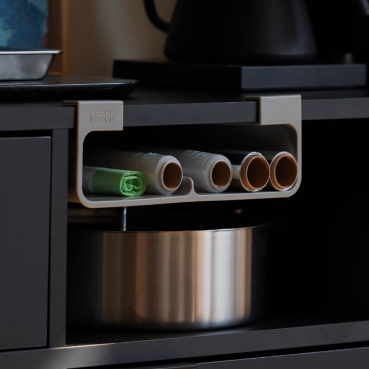 This innovative design makes use of unused space underneath your cupboard shelf with two open-ended compartments for storing rolls or boxes of cling film, baking foil, baking paper or bin liners.