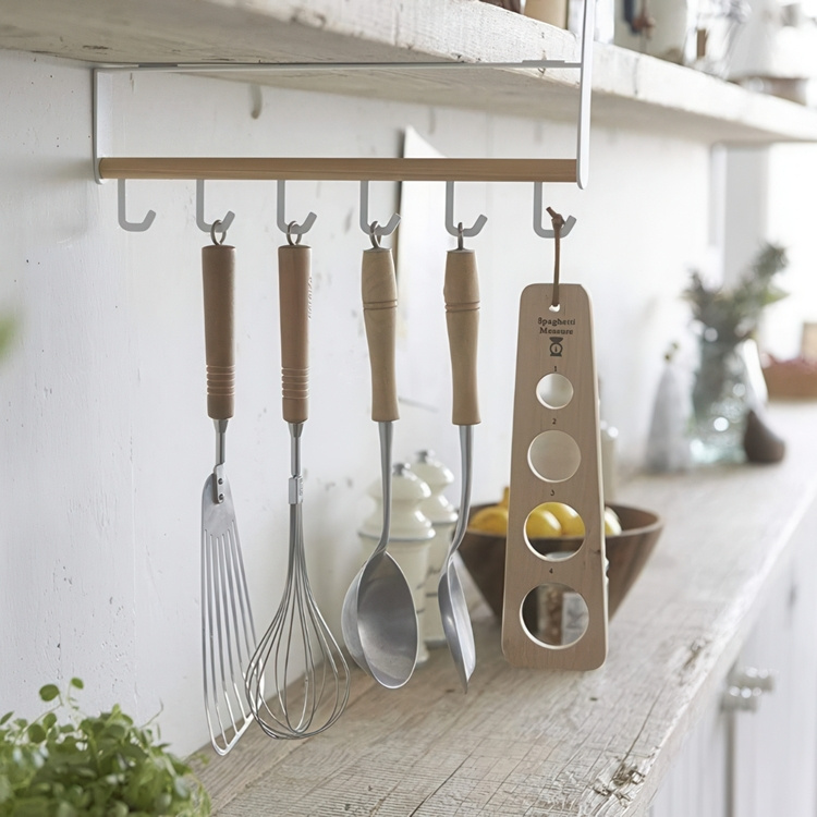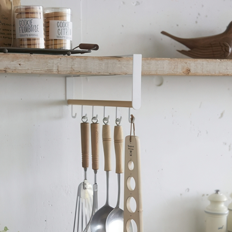 A stylish kitchen tool with 6 hooks from Japanese Yamazaki. Attached it to the underside of your cabinet or shelf. No screws or glue needed. Looks good and is space-saving.