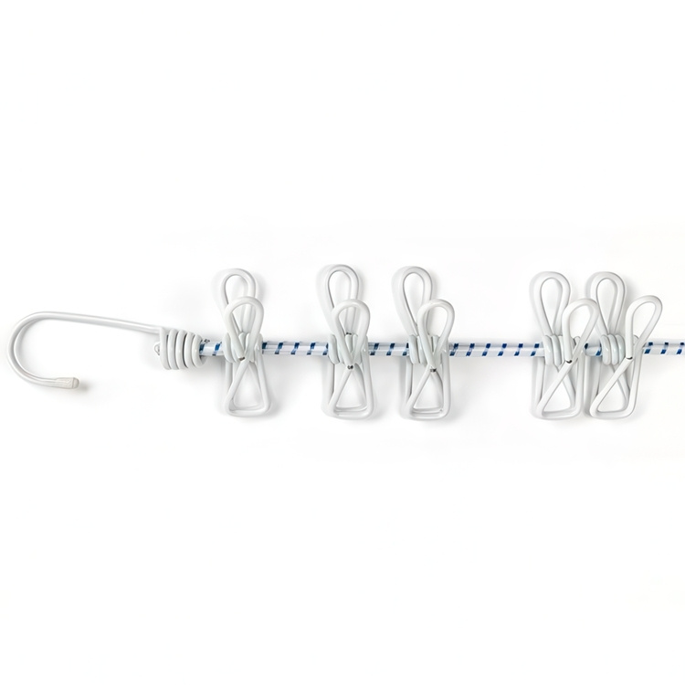 Multifunctional elastic rope with 10 large clips and a hook on either end.