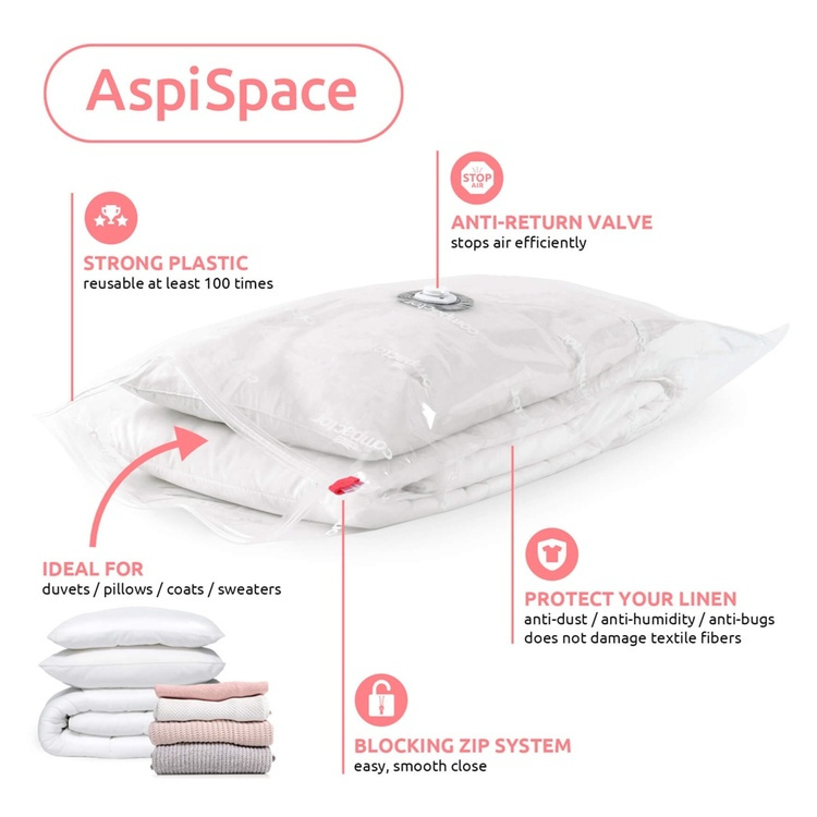 Vacuum bags are ideal for increasing your storage space as bulky fabrics are reduced up to 75% when the air is sucked out of the bag with the help of your vacuum cleaner. Protects against moisture, odor, dirt and insects. The bags can be used several times. -